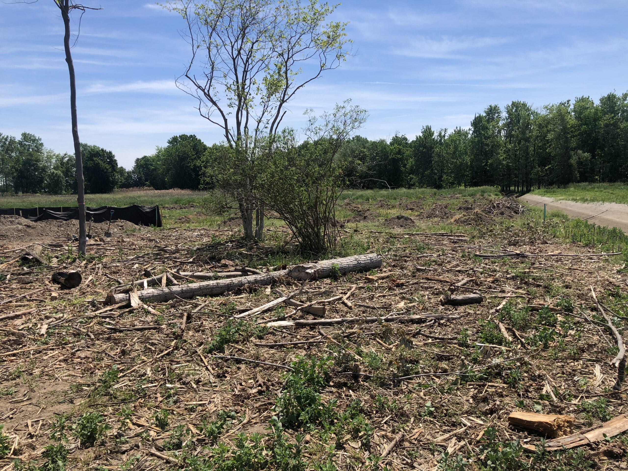 Application de legs biologiques (matière organique: bois, feuilles, terre), issus des milieux déboisés, à l’intérieur des parcelles où les arbres de gros calibre ont été transplantés (côté ouest de la rivière aux Brochets).
