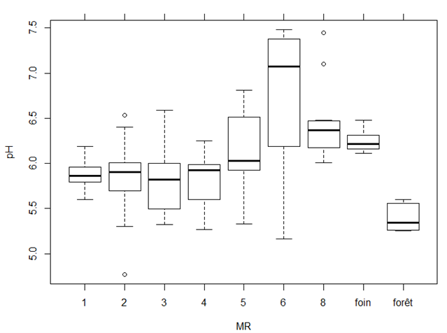 Les résultats des mesures du pH des différents milieux du site révèlent une faible variation entre ceux-ci (voir figure ci-dessous). Une tendance autour d’un pH entre 6 et 6,5 s’observe parmi les milieux échantillonnés, à l’exception du site (MR6) dont le pH est de 7. Également, le sol forestier est caractérisé par une plus forte acidité que les autres sols.